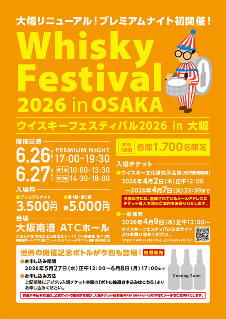 今年の「ウイスキーフェスティバル2026 in 大阪」は変則3部制として、6月26日(金)と27日(土)の2日間、大阪南港 ATCホールにて開催!